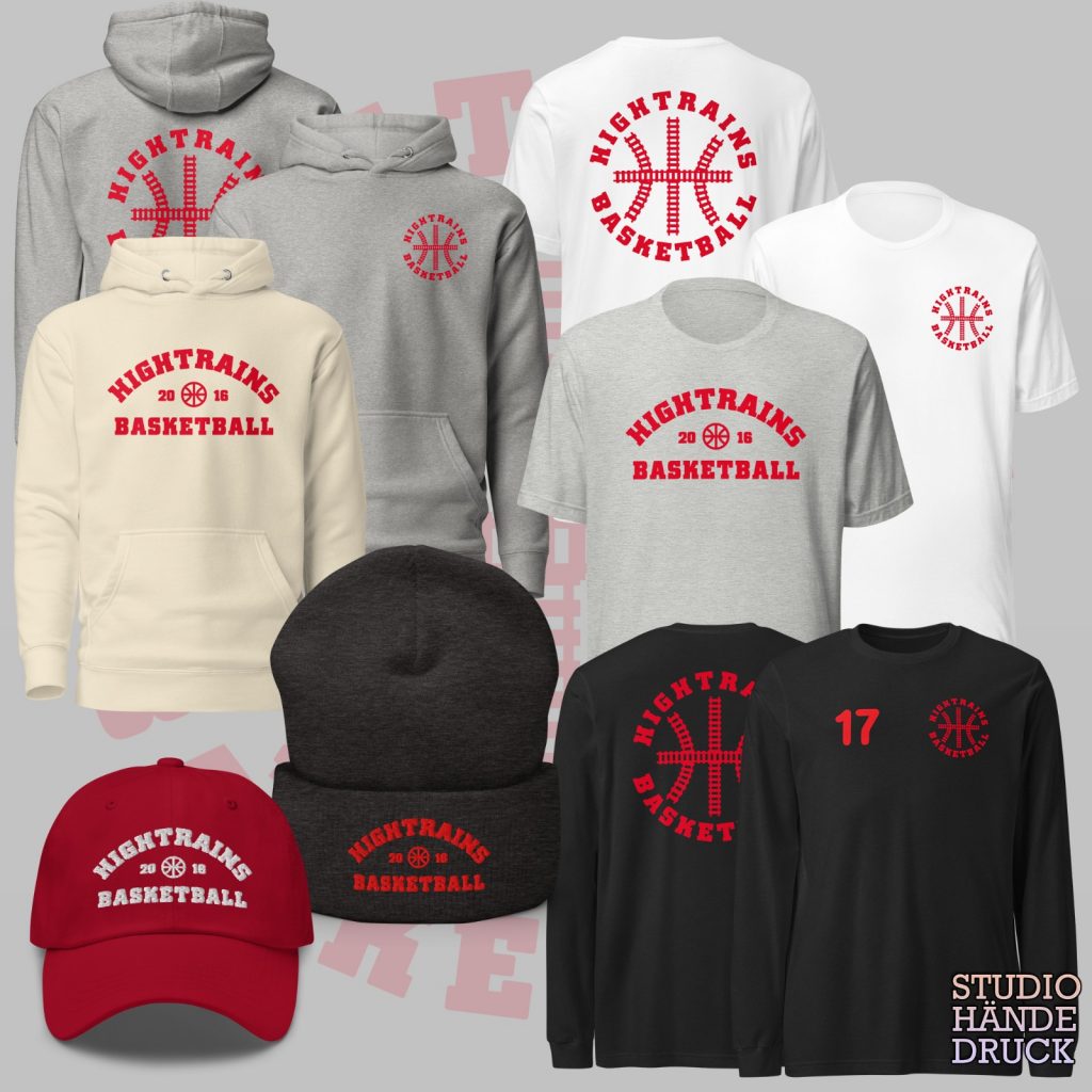 Entscheide Dich wie das Basketballteam “Hightrains” aus Hamburg für ein Merchandise-Gesamtpaket und wir erstellen für Dich verschiedene individuelle Designs ganz nach Deinen persönlichen Vorstellungen!